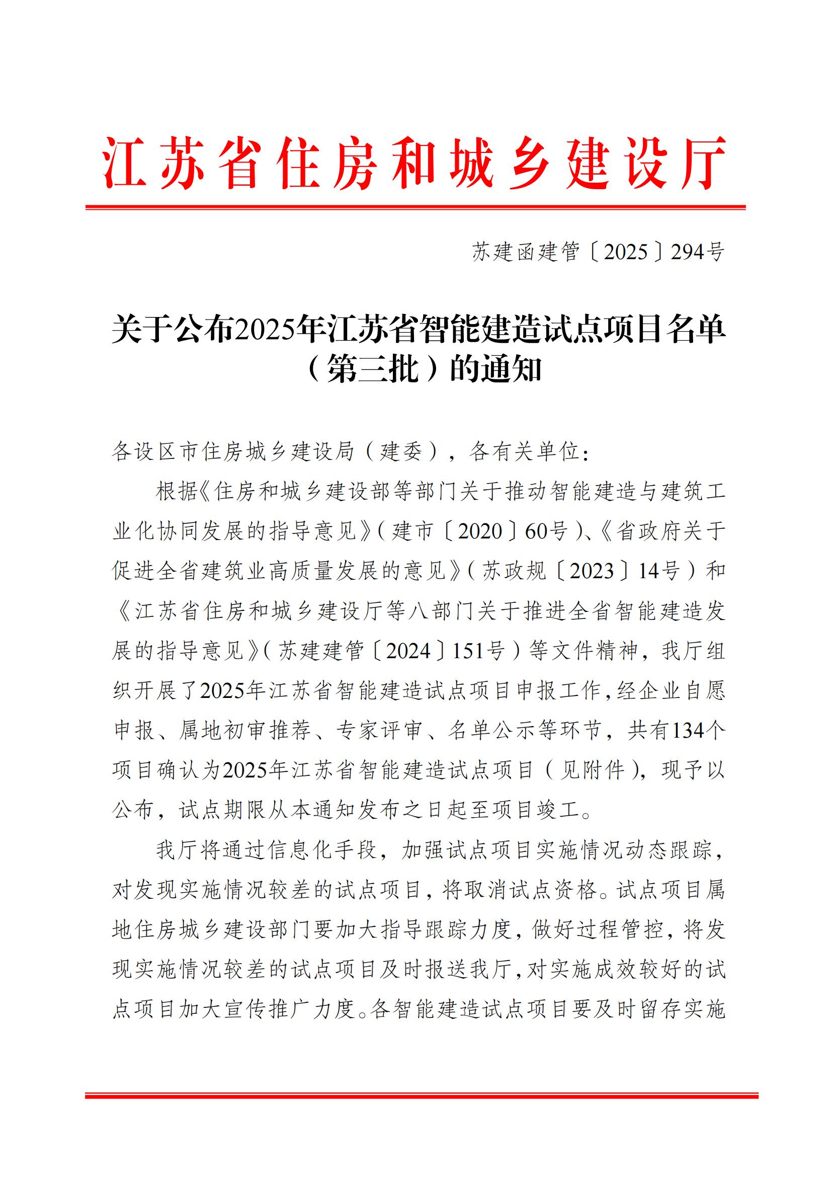 近日,江苏省住房和城乡建设厅正式公布了2025年度江苏省智能建造试点项目名单(···