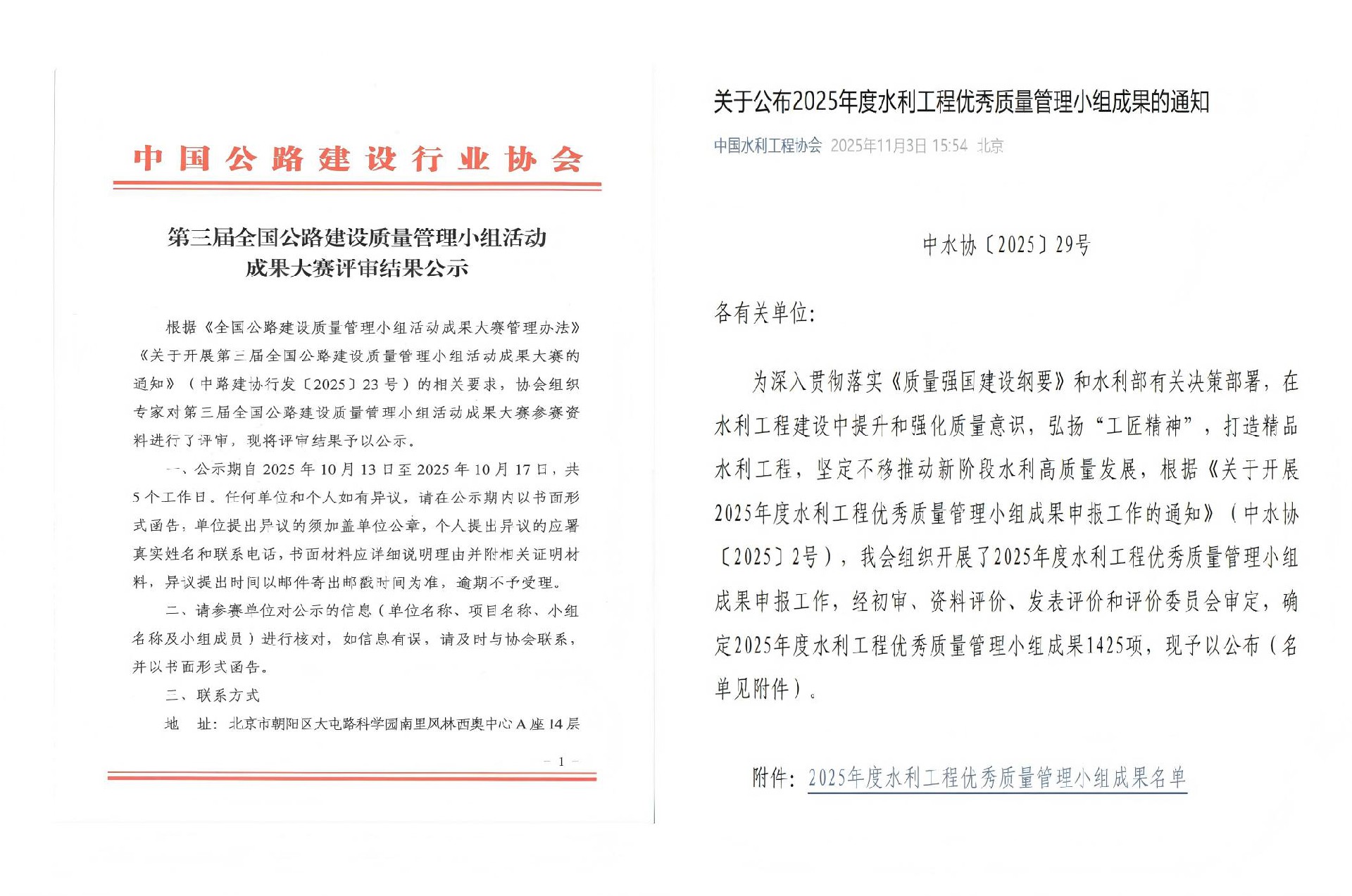 近日,中国公路建设行业协会、中国水利工程协会先后公布了第三届全国公路建设质量管理小组活动成果评审结果和2025年度水利企业质量管理小组竞赛活动结果。“···