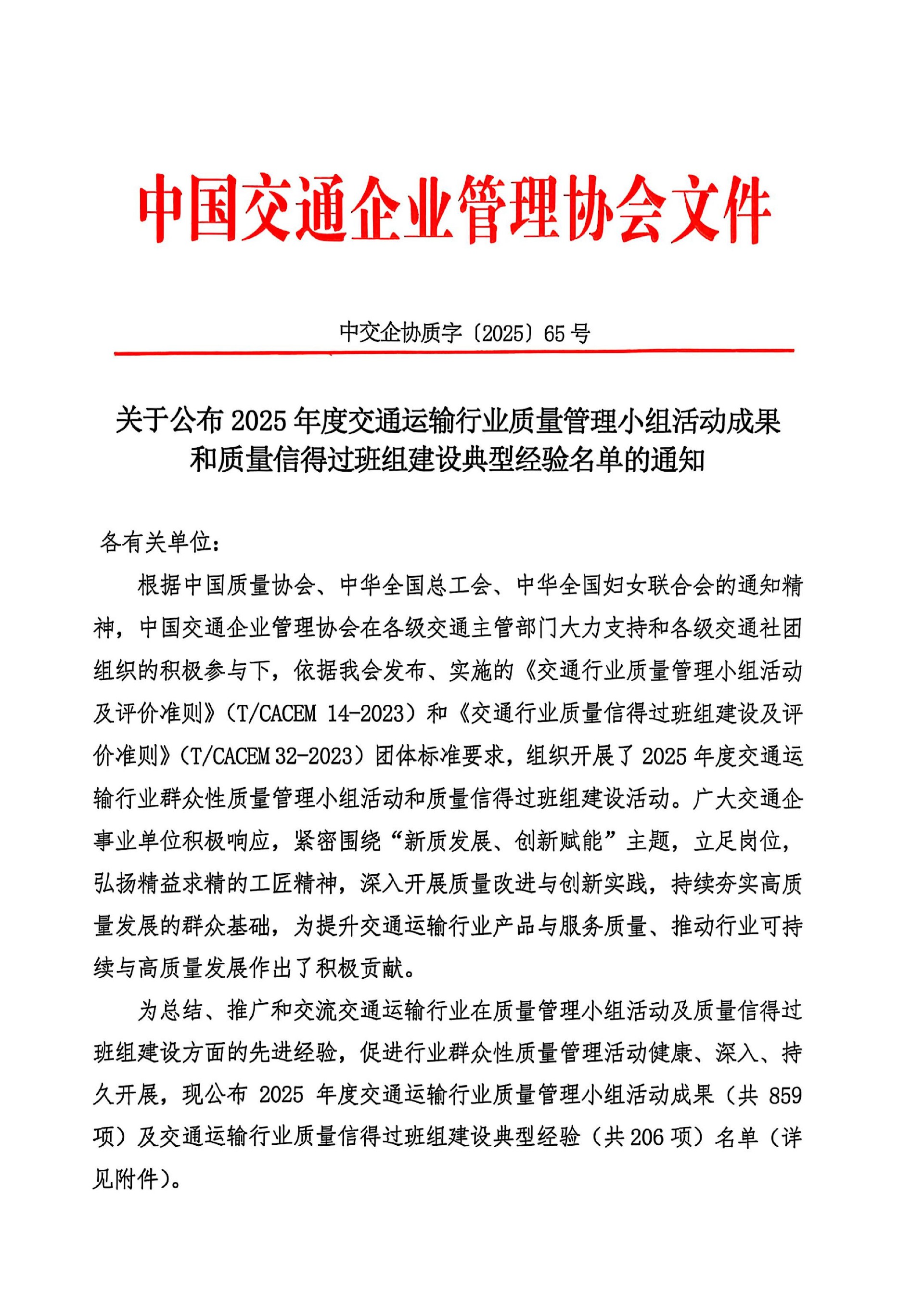 • 2025-11-21 公司质量管理成果荣获全国交通运输行业一等奖